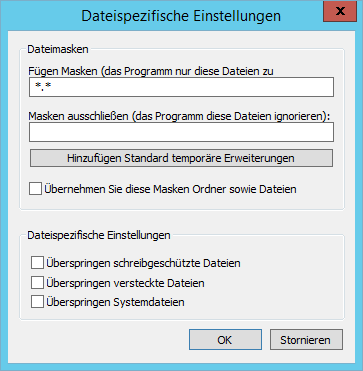 Handy Backup ermöglicht die Filterung der in der Backup-Aufgabe eingeschlossenen Daten durch die Benutzung der Dateimasken. Ob Sie ein Backup nur von Dateien einer spezifischen Art (z.B.: Backup aller Word-Dateien im Ordner) erstellen oder umgekehrt bestimmte Dateien (z.B.: alles ausser Media-Dateien sichern) ausschliessen möchten, ermöglicht es Ihnen das Programm in ein paar Schritten.