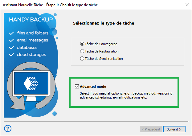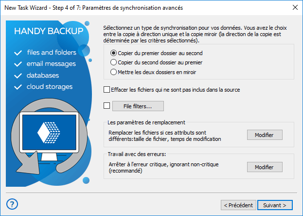 Handy Backup assure la synchronisation des fichiers et dossiers. La synchronisation peut être unidirectionnelle (d’une source vers une autre) ou bidirectionnelle (copie des fichiers jusqu’à obtenir une parfaite correspondance entre les deux emplacements).