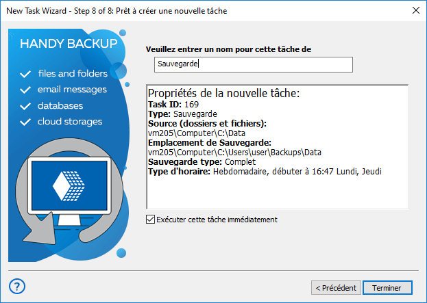 Après avoir défini tous les paramètres nécessaires, à la dernière étape de création de la tâche, vous pouvez consulter l’ensemble de ses propriétés dans une seule fenêtre : objets à sauvegarder, emplacement de stockage, planning, type de sauvegarde. Si besoin, il est possible de revenir à l’étape précédente pour modifier un paramètre.