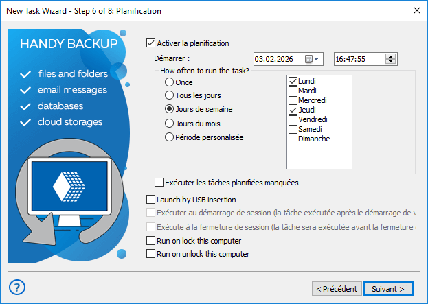 Handy Backup effectue des sauvegardes automatiques planifiées, configurées selon les préférences de l’utilisateur. La fréquence d’exécution peut aller de quelques minutes à plusieurs fois par an.