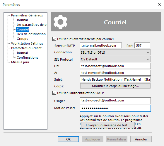 Handy Backup permet de configurer des notifications par e-mail concernant les résultats des tâches de sauvegarde, de restauration ou de synchronisation. Ainsi, l’utilisateur est informé en temps utile en cas de problème lors de l’exécution d’une opération.